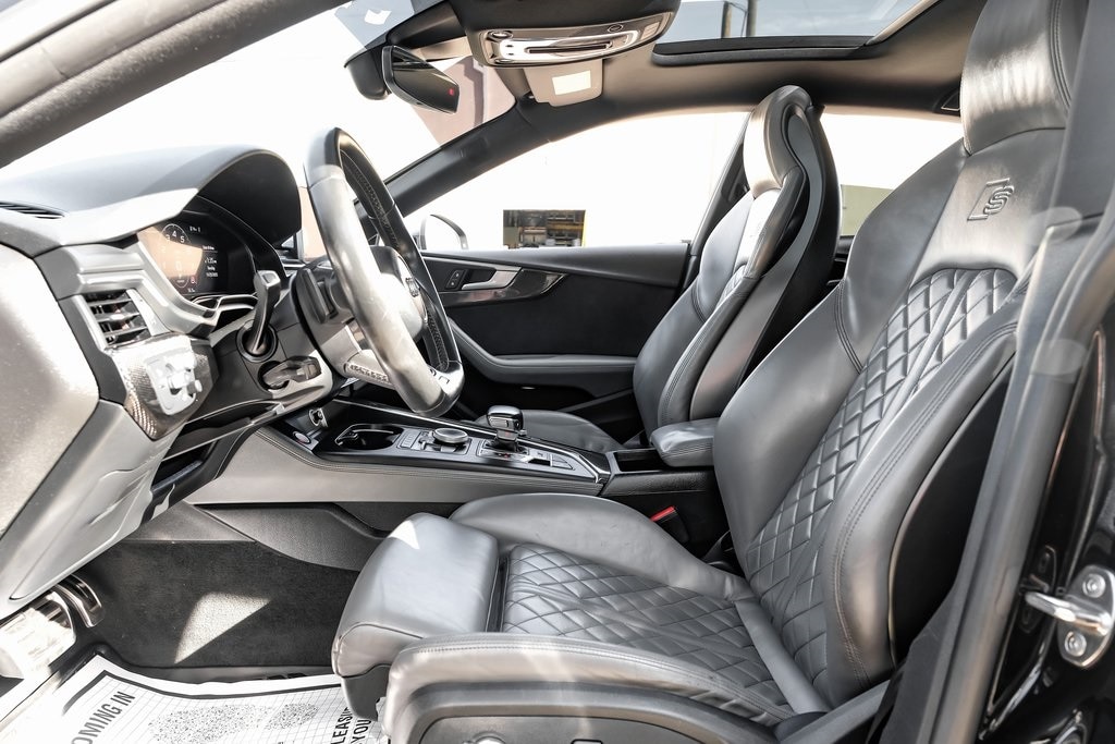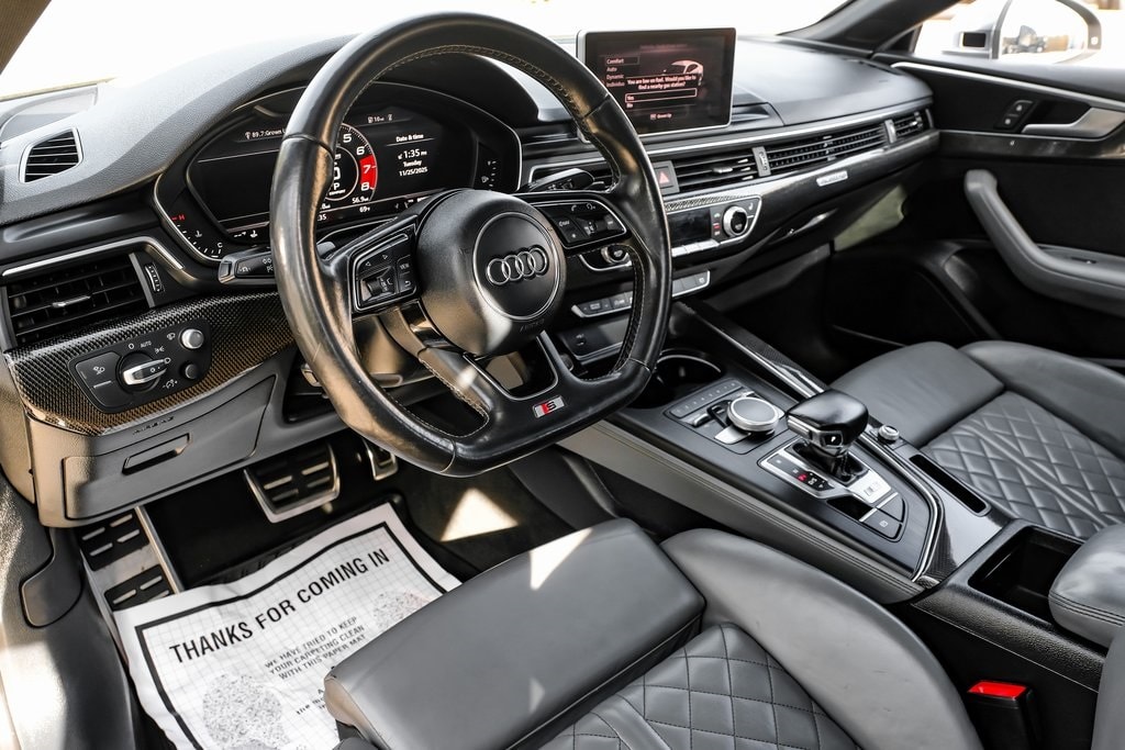 Priced below KBB Fair Purchase Price! Black Metallic 2018 Audi S5 3.0T Prestige quattro quattro 8-Speed Automatic with Tiptronic 3.0L TFSI Adaptive Cruise Control w/Traffic Jam Assist, Audi Active Lane Assist, Driver Assistance Package, Front & Rear Red Brake Calipers, High-Beam Assistant, S Sport Package, Sport Adaptive Damping Suspension, Sport Rear Differential, Traffic Sign Recognition. Driver Assistance Package (Adaptive Cruise Control w/Traffic Jam Assist, Audi Active Lane Assist, High-Beam Assistant, and Traffic Sign Recognition), S Sport Package (Front & Rear Red Brake Calipers, Sport Adaptive Damping Suspension, and Sport Rear Differential), Interior Lighting Package Plus, Navigation Package (12.3" LCD Display Audi Virtual Cockpit and Audi MMI Navigation Plus w/MMI Touch), Prestige (Bang & Olufsen Sound System w/3D Sound, Full Color Head-Up Display, and Top View Camera System), 10 Speakers, 4-Wheel Disc Brakes, ABS brakes, Air Conditioning, Alloy wheels, AM/FM radio: SiriusXM, Audi smartphone interface (Apple CarPlay/Android Auto), Auto High-beam Headlights, Auto-dimming door mirrors, Auto-dimming Rear-View mirror, Automatic temperature control, Brake assist, Bumpers: body-color, Carbon Atlas Inlays, Compass, Delay-off headlights, Driver door bin, Driver vanity mirror, Dual front impact airbags, Dual front side impact airbags, Electronic Stability Control, Emergency communication system: Audi connect CARE, Exterior Parking Camera Rear, Four wheel independent suspension, Front & Rear Black Audi Guard All-Weather Mats, Front anti-roll bar, Front Bucket Seats, Front Center Armrest, Front dual zone A/C, Front fog lights, Front reading lights, Garage door transmitter: HomeLink, Heated door mirrors, Heated Front S Sport Seats, Heated front seats, Illuminated entry, Knee airbag, Leather Shift Knob, Leather steering wheel, Leather/Alcantara Seating Surfaces, Traction control, Trip computer, Turn signal indicator mirrors, USB Cables (DISC), Variably intermittent wipers, Wheels: 18" x 8.5" 5-Double-Spoke-Star Design, and Wheels: 19" x 8.5" 5-Spoke-Cavo Design.