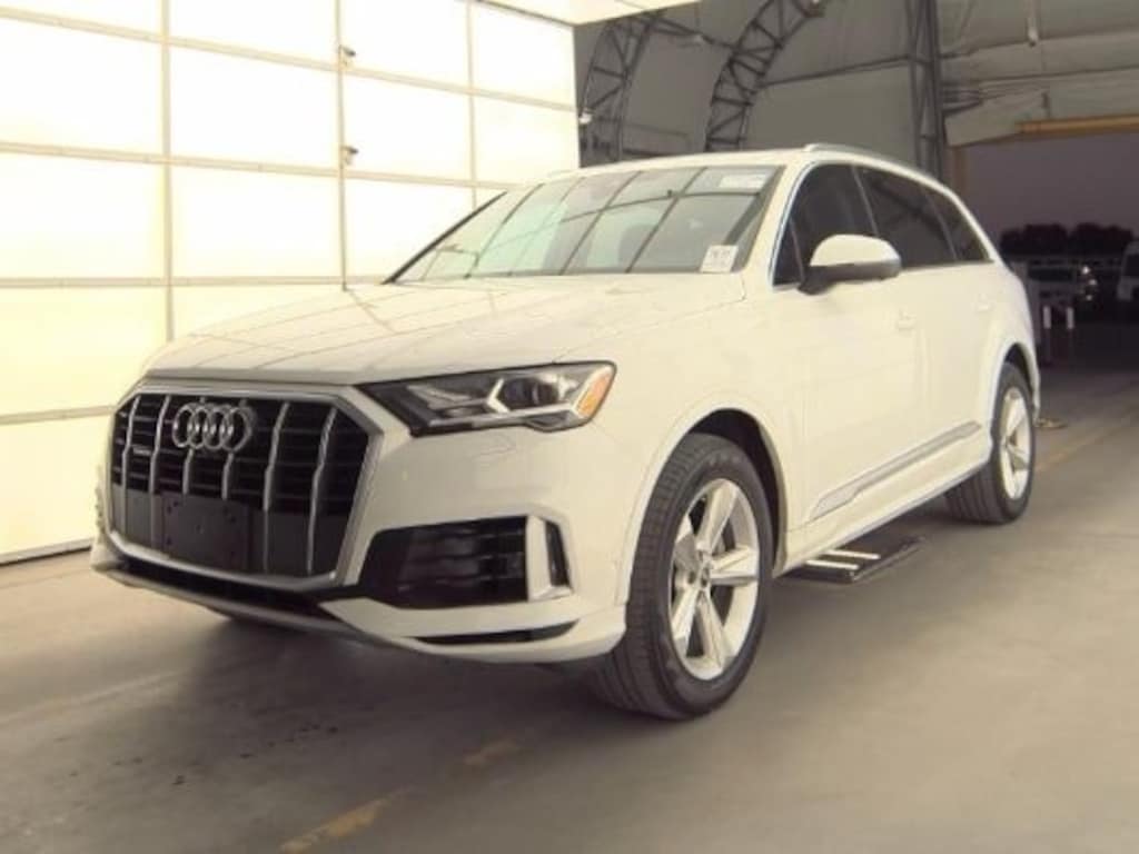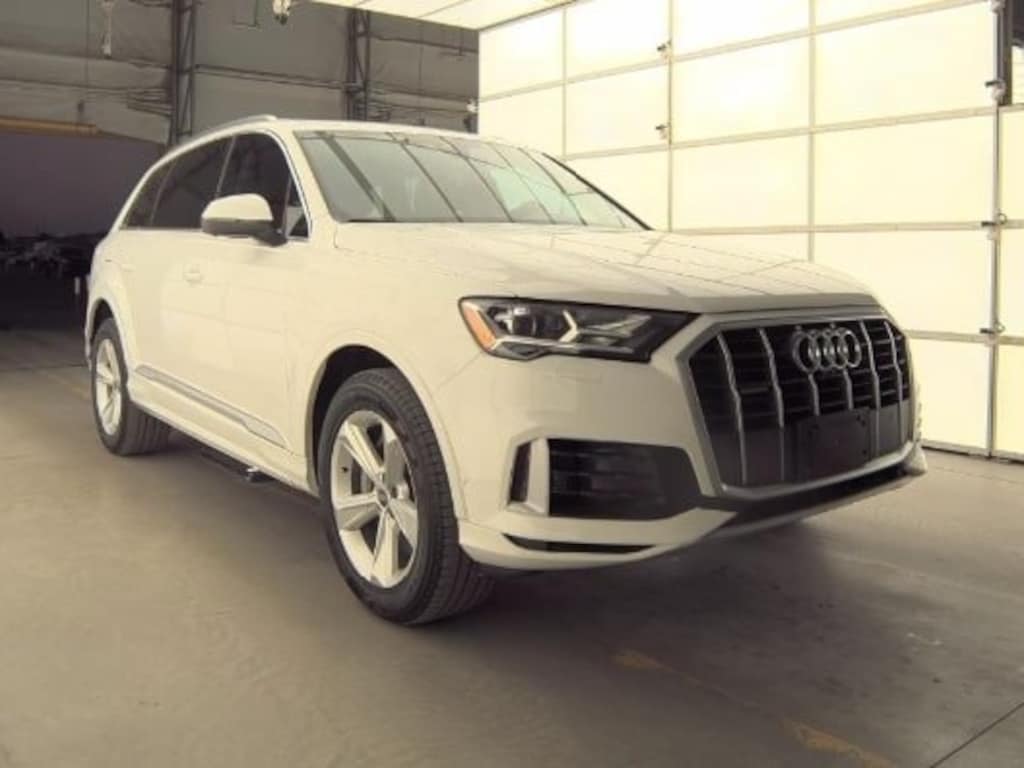 Priced below KBB Fair Purchase Price! Carrara White 2021 Audi Q7 55 Premium quattro, Convenience Package quattro 8-Speed Automatic with Tiptronic 3.0L TFSI V6 DOHC 3-Spoke Multifunction Steering Wheel w/Paddles, Ambient Interior Lighting Package, Audi Phone Box w/Wireless Charging, Convenience Package, Heated Auto-Dimming Power Folding Exterior Mirrors, Interior Protection Package, Topview Camera System, Tow Hitch Receiver, Towing Package. Ambient Interior Lighting Package, Convenience Package (3-Spoke Multifunction Steering Wheel w/Paddles, Audi Phone Box w/Wireless Charging, Heated Auto-Dimming Power Folding Exterior Mirrors, and Topview Camera System), Interior Protection Package, Towing Package (Tow Hitch Receiver), 10 Speakers, 3.204 Axle Ratio, 3rd row seats: bench, 4-Wheel Disc Brakes, ABS brakes, Air Conditioning, Alloy wheels, AM/FM radio: SiriusXM, Audi smartphone interface (Apple CarPlay/Android Auto), Auto High-beam Headlights, Auto-dimming Rear-View mirror, Automatic temperature control, Brake assist, Bumpers: body-color, Compass, Delay-off headlights, Driver door bin, Driver vanity mirror, Dual front impact airbags, Dual front side impact airbags, Electronic Stability Control, Emergency communication system: Audi connect CARE, PRIME & PLUS, Exterior Parking Camera Rear, Four wheel independent suspension, Front & Rear Doors Audi Beam-Rings, Front anti-roll bar, Front Bucket Seats, Front Center Armrest, Front dual zone A/C, Front fog lights, Front reading lights, Fully automatic headlights, Garage door transmitter: HomeLink, Genuine wood door panel insert, Gray/Brown Fine Grain Ash Natural Wood Inlays, Heated door mirrors, Heated Front Bucket Seats, Heated front seats, Illuminated entry, Leather Seating Surfaces, Leather Shift Knob, Leather steering wheel, Low tire pressure warning, Memory seat, Navigation system: Audi MMI Navigation plus with Touch Response, Occupant sensing airbag, Outside temperature display, Overhead airbag, Overhead console, Panic alarm, Passenger door bin, Passenger vanity mirror, Power door mirrors, Power driver seat, Power Liftgate, Power moonroof, Power passenger seat, Power steering, Power windows, Radio data system, Radio: Audi Sound System, Rain sensing wipers, Rear air conditioning, Rear anti-roll bar, Rear fog lights, Rear reading lights, Rear seat center armrest, Rear window defroster, Rear window wiper, Reclining 3rd row seat, Remote keyless entry, Roof rack: rails only, Security system, Speed control, Speed-sensing steering, Split folding rear seat, Spoiler, Steering wheel memory, Steering wheel mounted audio controls, Tachometer, Telescoping steering wheel, Tilt steering wheel, Traction control, Trip computer, Turn signal indicator mirrors, Variably intermittent wipers, and Wheels: 19" 5-Arm-Star Design.