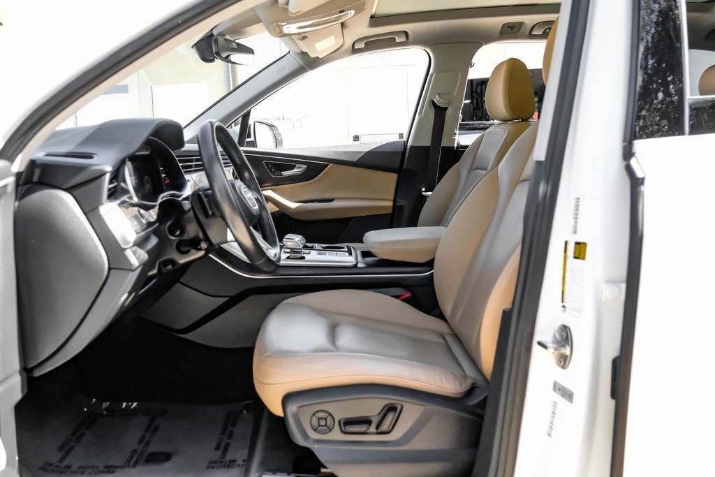 Carrara White 2021 Audi Q7 55 Premium quattro, Convenience Package quattro 8-Speed Automatic with Tiptronic 3.0L TFSI V6 DOHC 3-Spoke Multifunction Steering Wheel w/Paddles, Ambient Interior Lighting Package, Audi Phone Box w/Wireless Charging, Convenience Package, Heated Auto-Dimming Power Folding Exterior Mirrors, Interior Protection Package, Topview Camera System, Tow Hitch Receiver, Towing Package. Ambient Interior Lighting Package, Convenience Package (3-Spoke Multifunction Steering Wheel w/Paddles, Audi Phone Box w/Wireless Charging, Heated Auto-Dimming Power Folding Exterior Mirrors, and Topview Camera System), Interior Protection Package, Towing Package (Tow Hitch Receiver), 10 Speakers, 3.204 Axle Ratio, 3rd row seats: bench, 4-Wheel Disc Brakes, ABS brakes, Air Conditioning, Alloy wheels, AM/FM radio: SiriusXM, Audi smartphone interface (Apple CarPlay/Android Auto), Auto High-beam Headlights, Auto-dimming Rear-View mirror, Automatic temperature control, Brake assist, Bumpers: body-color, Compass, Delay-off headlights, Driver door bin, Driver vanity mirror, Dual front impact airbags, Dual front side impact airbags, Electronic Stability Control, Emergency communication system: Audi connect CARE, PRIME & PLUS, Exterior Parking Camera Rear, Four wheel independent suspension, Front & Rear Doors Audi Beam-Rings, Front anti-roll bar, Front Bucket Seats, Front Center Armrest, Front dual zone A/C, Front fog lights, Front reading lights, Fully automatic headlights, Garage door transmitter: HomeLink, Genuine wood door panel insert, Gray/Brown Fine Grain Ash Natural Wood Inlays, Heated door mirrors, Heated Front Bucket Seats, Heated front seats, Illuminated entry, Leather Seating Surfaces, Leather Shift Knob, Leather steering wheel, Low tire pressure warning, Memory seat, Navigation system: Audi MMI Navigation plus with Touch Response, Occupant sensing airbag, Outside temperature display, Overhead airbag, Overhead console, Panic alarm, Passenger door bin, Passenger vanity mirror, Power door mirrors, Power driver seat, Power Liftgate, Power moonroof, Power passenger seat, Power steering, Power windows, Turn signal indicator mirrors, Variably intermittent wipers, and Wheels: 19" 5-Arm-Star Design.