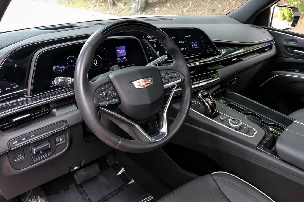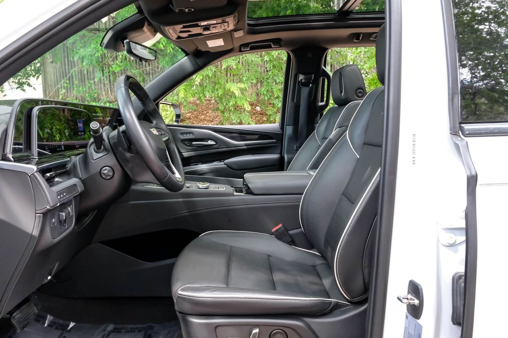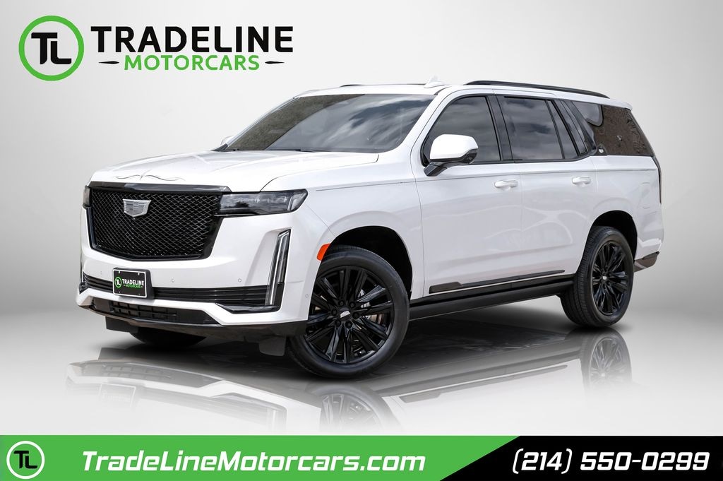 CARFAX One-Owner. Crystal White Tricoat 2023 Cadillac Escalade Sport RWD 10-Speed Automatic 6.2L V8 Jet Black w/Leather Seating w/Precision Perforated Inserts, Adaptive Cruise Control, Air Ride Adaptive Suspension, AKG Studio 19-Speaker Audio System, Automatic Seat Belt Tightening, Body-Color Door Handles, Door Lock & Latch Shields, Electronic Limited-Slip Differential, Enhanced Automatic Emergency Braking, Enhanced Automatic Parking Assist, Glass Breakage Sensor, Heated & Ventilated Driver & Front Passenger Seats, Hitch Guidance w/Hitch View, Illuminating Front & Rear Sill Plates, Integrated Trailer Brake Controller, Power Panoramic Tilt-Sliding Sunroof, Preferred Equipment Group 1SC, Rear Camera Mirror, Rear Camera Mirror Washer, Rear Cross Traffic Alert, Reconfigurable Full-Color Head-Up Display, Reverse Automatic Braking, Running Board Assist Steps, Smart Trailer Integration Indicator, Soft Closing Front & Rear Doors, Theft-Deterrent Alarm System, Touring Package, Trailer Side Blind Zone Alert, Vehicle Inclination Sensor, Vehicle Interior Movement Sensor. Preferred Equipment Group 1SC (Adaptive Cruise Control, AKG Studio 19-Speaker Audio System, Automatic Seat Belt Tightening, Body-Color Door Handles, Door Lock & Latch Shields, Electronic Limited-Slip Differential, Enhanced Automatic Emergency Braking, Enhanced Automatic Parking Assist, Glass Breakage Sensor, Heated & Ventilated Driver & Front Passenger Seats, Hitch Guidance w/Hitch View, Integrated Trailer Brake Controller, Power Panoramic Tilt-Sliding Sunroof, Rear Camera Mirror, Rear Camera Mirror Washer, Rear Cross Traffic Alert, Reconfigurable Full-Color Head-Up Display, Reverse Automatic Braking, Running Board Assist Steps, Smart Trailer Integration Indicator, Theft-Deterrent Alarm System, Trailer Side Blind Zone Alert, Vehicle Inclination Sensor, and Vehicle Interior Movement Sensor), Touring Package (Air Ride Adaptive Suspension, Illuminating Front & Rear Sill Plates, and Soft Closing Front & Rear Doors), Jet Black w/Leather Seating w/Precision Perforated Inserts, 16.9" Diagonal OLED Infotainment Screen, 19 Speakers, 2-Presets Memory For Driver Seat Adjuster, 2-Way Driver Power Lumbar Seat Adjuster, 2-Way Front Passenger Power Lumbar Seat Adjuster, 3 Years of OnStar & Connected Services Plan, 3.23 Axle Ratio, 3rd row seats: split-bench, 4-Way Power Driver Lumbar Seat Adjuster, 4-Way Power Front Passenger Lumbar Seat Adjuster, 4-Wheel Disc Brakes, 8-Way Power Driver Seat Adjuster, 8-Way Power Front Passenger Seat Adjuster, ABS brakes, Adaptive suspension, Air Conditioning, Alloy wheels, AM/FM radio: SiriusXM with 360L, Apple CarPlay/Android Auto, Audio memory, Auto High-beam Headlights, Auto tilt-away steering wheel, Auto-dimming door mirrors, Auto-dimming Rear-View mirror, Automatic temperature control, Brake assist, Bumpers: body-color, Compass, Delay-off headlights, Driver door bin, Driver vanity mirror, Dual front impact airbags, Dual front side impact airbags, Electronic Stability Control, Emergency communication system: OnStar and Cadillac connected services capable, Exterior Parking Camera Rear, Four wheel independent suspension, Front anti-roll bar, Front Bucket Seats, Front Center Armrest w/Storage, Front dual zone A/C, Front License Plate Bracket, Front reading lights, Fully automatic headlights, Garage door transmitter, HD Radio, Heads-Up Display, Heated door mirrors, Heated Driver & Front Passenger Seats, Heated front seats, Heated rear seats, Heated steering wheel, Illuminated entry, Leather Seating Surfaces w/Precision Perf Inserts, Low tire pressure warning, Magnetic Ride Control Suspension, Memory seat, Navigation System, Not Equipped w/2nd Row Express-Up Window Control, Not Equipped w/4-Way Driver & Fr Pass Pwr Lumbar, Occupant sensing airbag, Outside temperature display, Overhead airbag, Overhead console, Panic alarm, Passenger door bin, Passenger vanity mirror, Power door mirrors, Power driver seat, Power Liftgate, Power moonroof, Power passenger