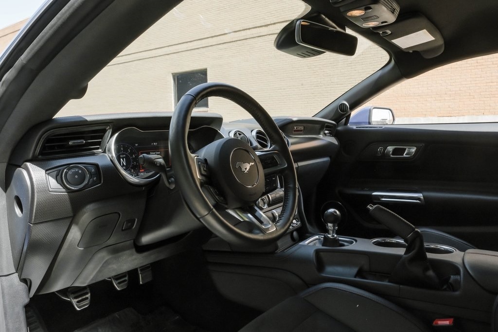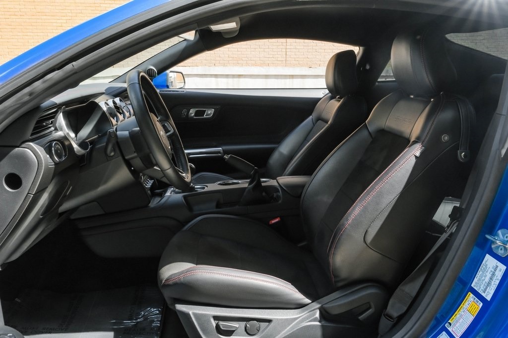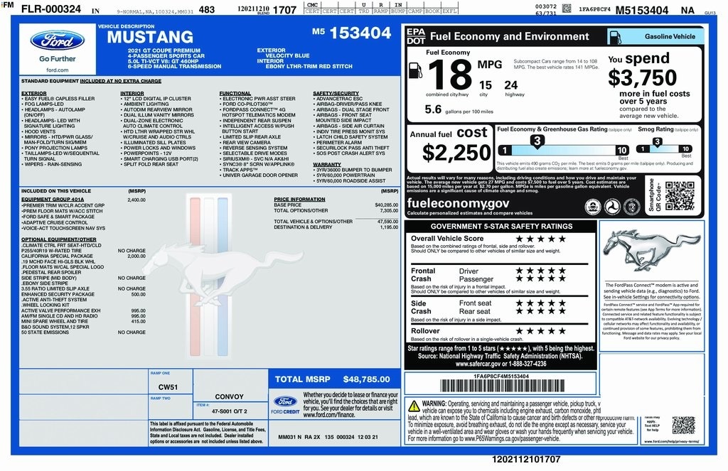 CARFAX One-Owner. Velocity Blue Metallic 2021 Ford Mustang GT Premium California Special Package, $47,590 ORIGINAL MSRP! RWD 6-Speed Manual 5.0L V8 Ti-VCT 12" LCD Digital Instrument Cluster w/MyColor, Active Anti-Theft System, Adaptive Cruise Control, California Special Instrument Panel Applique Badge, California Special Package, California Special Script Rear Badging, Carbon Hex Aluminum Instrument Panel, Enhanced Security Package, Equipment Group 401A, Floor Mats w/Red Contrast Stitching, Ford Safe & Smart Package, Heated Steering Wheel, Integrated Turn Signals, Leather-Trimmed Bucket Seats w/Color Accents, Leather-Trimmed Bucket Seats w/Miko Suede Inserts, Memory Driver Seat, Mirrors & Ambient Lighting, Miko Suede Door Inserts w/Red Contrast Stitching, Pedestal Rear Spoiler, Unique Front Grilles w/Offset Tri-Bar Pony Logo, Voice-Activated Touch-Screen Navigation System, Wheel Locking Kit, Wheels: 19" x 8.5" Machined-Face Aluminum. California Special Package (California Special Instrument Panel Applique Badge, California Special Script Rear Badging, Carbon Hex Aluminum Instrument Panel, Floor Mats w/Red Contrast Stitching, Leather-Trimmed Bucket Seats w/Miko Suede Inserts, Miko Suede Door Inserts w/Red Contrast Stitching, Pedestal Rear Spoiler, Unique Front Grilles w/Offset Tri-Bar Pony Logo, and Wheels: 19" x 8.5" Machined-Face Aluminum), Enhanced Security Package (Active Anti-Theft System and Wheel Locking Kit), Equipment Group 401A (12" LCD Digital Instrument Cluster w/MyColor, Heated Steering Wheel, Integrated Turn Signals, Leather-Trimmed Bucket Seats w/Color Accents, and Memory Driver Seat, Mirrors & Ambient Lighting), Ford Safe & Smart Package (Adaptive Cruise Control and Voice-Activated Touch-Screen Navigation System), 3.55 Limited Slip Rear Axle, 4-Wheel Disc Brakes, 9 Speakers, ABS brakes, Active Valve Performance Exhaust, Air Conditioning, Alloy wheels, AM/FM radio: SiriusXM, AM/FM Stereo, Auto High-beam Headlights, Auto-dimming Rear-View mirror, Automatic temperature control, Black GT, 5.0 & Pony Badges, Brake assist, Bumpers: body-color, Climate Controlled Heated/Cooled Front Seats, Compass, Delay-off headlights, Driver door bin, Driver vanity mirror, Dual front impact airbags, Dual front side impact airbags, Ebony Mid Body Side Stripe, Electronic Stability Control, Emergency communication system: 911 Assist, Exterior Parking Camera Rear, Four wheel independent suspension, Front anti-roll bar, Front Bucket Seats, Front Center Armrest, Front dual zone A/C, Front fog lights, Front reading lights, Fully automatic headlights, Garage door transmitter, HD Radio, Heated door mirrors, Heated front seats, Illuminated entry, Knee airbag, Leather Shift Knob, Leather-Trimmed Bucket Seats, Linked Graphite Aluminum Instrument Panel, Low tire pressure warning, Occupant sensing airbag, Outside temperature display, Overhead airbag, Overhead console, Panic alarm, Passenger door bin, Passenger vanity mirror, Power door mirrors, Power driver seat, Power passenger seat, Power steering, Power windows, Premium Floor Mats w/Accent Stitch, Radio data system, Radio: B&O Sound System by Bang & Olufsen, Rain sensing wipers, Rear anti-roll bar, Rear window defroster, Remote keyless entry, Security system, SiriusXM Radio, Speed control, Speed-sensing steering, Speed-Sensitive Wipers, Split folding rear seat, Spoiler, Steering wheel mounted audio controls, SYNC 3 Communications & Entertainment System, Tachometer, Telescoping steering wheel, Tilt steering wheel, Traction control, Trip computer, Variably intermittent wipers, Ventilated front seats, Voltmeter, and Wheels: 18" x 8" Machined-Face Aluminum.