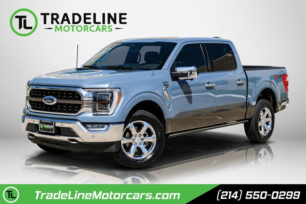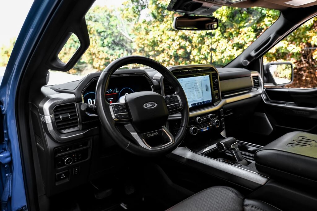 CARFAX One-Owner. Azure Gray Metallic Tri-Coat 2023 Ford F-150 King Ranch 4WD 10-Speed Automatic 3.5L V6 EcoBoost 4WD, 4x4 FX4 Off-Road Bodyside Decal, Bed Utility Package, BoxLink, Bright Belt Moldings, Chrome Door Handles w/Body-Color Strap, Chrome Skull Caps on Exterior Mirrors, Class IV Trailer Hitch Receiver, Electronic Locking w/3.31 Axle Ratio, Equipment Group 601A High, Extended Range 36 Gallon Fuel Tank, FX4 Off-Road Package, Hill Descent Control, Integrated Trailer Brake Controller, King Ranch Chrome Appearance Package, LED Box Lighting, Max Trailer Tow Package, Monotube Rear Shocks, Multi-Contour Driver & Passenger Seats, Off-Road Tuned Front Shock Absorbers, Power Tailgate, Power-Deployable Running Boards, Pro Trailer Backup Assist & Pro Trailer Hitch Assist, Radio: B&O Unleashed Sound System by Bang & Olufsen, Rock Crawl Mode, Tailgate Step w/Tailgate Work Surface, Tray Style Floor Liner, Wheels: 20" Chrome-Like PVD. Bed Utility Package (BoxLink, LED Box Lighting, Power Tailgate, and Tailgate Step w/Tailgate Work Surface), Equipment Group 601A High (Multi-Contour Driver & Passenger Seats, Power-Deployable Running Boards, and Radio: B&O Unleashed Sound System by Bang & Olufsen), FX4 Off-Road Package (4x4 FX4 Off-Road Bodyside Decal, Electronic Locking w/3.31 Axle Ratio, Hill Descent Control, Monotube Rear Shocks, Off-Road Tuned Front Shock Absorbers, Rock Crawl Mode, and Tray Style Floor Liner), King Ranch Chrome Appearance Package (Bright Belt Moldings, Chrome Door Handles w/Body-Color Strap, Chrome Skull Caps on Exterior Mirrors, and Wheels: 20" Chrome-Like PVD), Max Trailer Tow Package (Class IV Trailer Hitch Receiver, Extended Range 36 Gallon Fuel Tank, Integrated Trailer Brake Controller, and Pro Trailer Backup Assist & Pro Trailer Hitch Assist), 4WD, 20" Machined-Aluminum Wheels, 360 Degree Camera, Trip computer, Turn signal indicator mirrors, Twin Panel Moonroof, Variably intermittent wipers, Ventilated front seats, and Voltmeter.