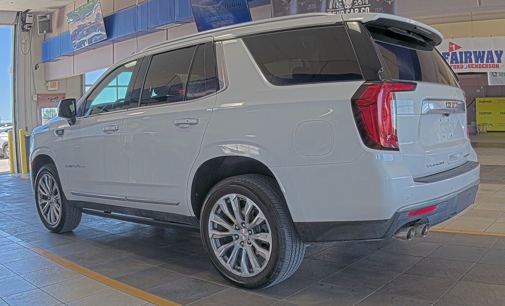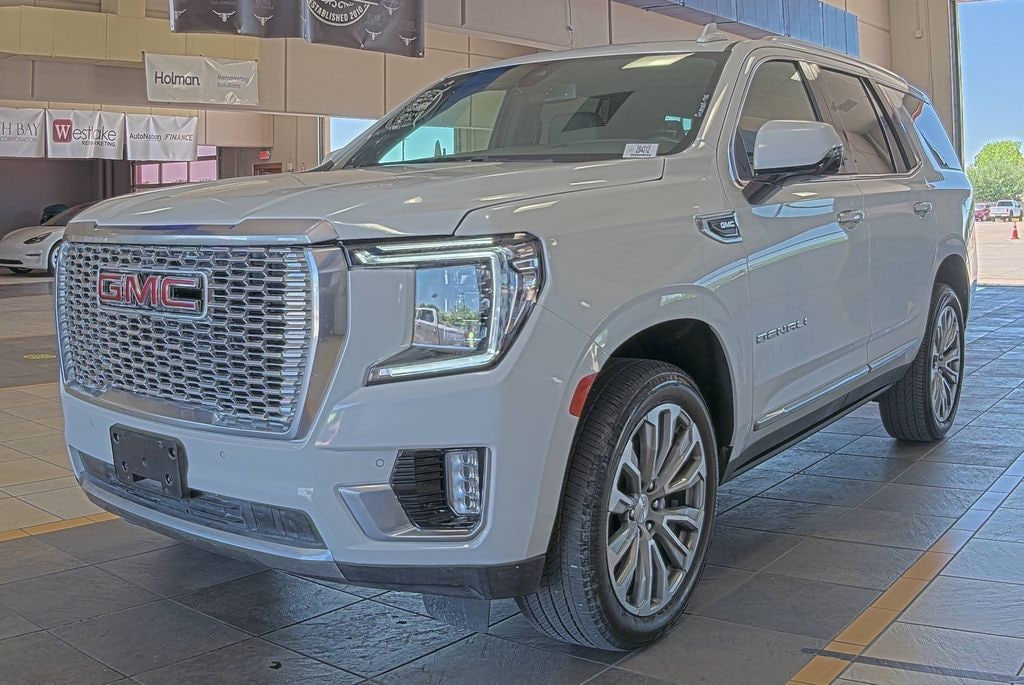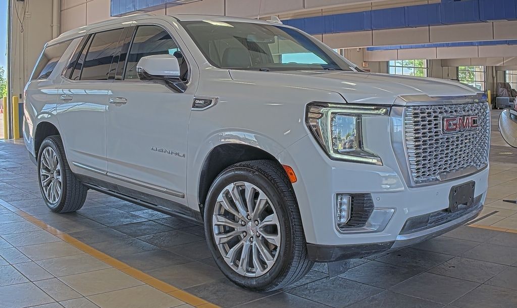 White Frost Tricoat 2022 GMC Yukon Denali RWD 10-Speed Automatic with Overdrive EcoTec3 6.2L V8 15" Diagonal Multi-Color Head-Up Display, 2 Presets For Outside Rearview Mirrors, 3 Years of GMC Connected Services, 3rd Row 60/40 Power-Folding Split-Bench Seat, Automatic Stop/Start, Bright Front & Rear Door Sill Plates, Chrome Door Handles w/Body-Color Strip, Dual Exhaust System, Floor Console, Galvano Bodyside Moldings, Hands-Free Power Programmable Rear Liftgate, HD Surround Vision, Heated & Ventilated Driver & Front Passenger Seats, Heated 2nd Row Outboard Position Seats, Heated Driver & Front Passenger Seats, Heated Steering Wheel, Inside Rear-View Auto-Dimming Mirror, License Plate Front Mounting Package, Outside Heated Power-Adjustable Mirrors, Power Release 2nd Row Bucket Seats, Power Tilt & Telescopic Steering Column, Preferred Equipment Group 5SA, Rear Pedestrian Alert, Safety Alert Seat, Start/Stop System Disable Button, Universal Home Remote, Wireless Charging. License Plate Front Mounting Package, Preferred Equipment Group 5SA (15" Diagonal Multi-Color Head-Up Display, 2 Presets For Outside Rearview Mirrors, 3 Years of GMC Connected Services, 3rd Row 60/40 Power-Folding Split-Bench Seat, Automatic Stop/Start, Bright Front & Rear Door Sill Plates, Chrome Door Handles w/Body-Color Strip, Dual Exhaust System, Floor Console, Galvano Bodyside Moldings, Hands-Free Power Programmable Rear Liftgate, HD Surround Vision, Heated & Ventilated Driver & Front Passenger Seats, Heated 2nd Row Outboard Position Seats, Heated Driver & Front Passenger Seats, Heated Steering Wheel, Inside Rear-View Auto-Dimming Mirror, Outside Heated Power-Adjustable Mirrors, Power Release 2nd Row Bucket Seats, Power Tilt & Telescopic Steering Column, Rear Pedestrian Alert, Safety Alert Seat, Start/Stop System Disable Button, Universal Home Remote, and Wireless Charging), 14 Speakers, 3.23 Rear Axle Ratio, 3rd row seats: split-bench, 4-Wheel Disc Brakes, ABS brakes, Adaptive suspension, Air Conditioning, Alloy wheels, AM/FM radio: SiriusXM with 360L, AM/FM Stereo, Apple CarPlay/Android Auto, Auto High-beam Headlights, Auto-dimming door mirrors, Auto-dimming Rear-View mirror, Auto-leveling suspension, Automatic Emergency Braking, Automatic temperature control, Bodyside moldings, Bose 14-Speaker Surround w/CenterPoint, Brake assist, Bumpers: body-color, Compass, Delay-off headlights, Driver door bin, Driver vanity mirror, Dual front impact airbags, Dual front side impact airbags, Dual-Pane Panoramic Power Sunroof, Electronic Stability Control, Emergency communication system: OnStar and GMC Connected Services capable, Floor Console w/Storage Area, Following Distance Indicator, Forward Collision Alert, Four wheel independent suspension, Front & Rear Park Assist, Front anti-roll bar, Front Bucket Seats, Front Center Armrest, Front dual zone A/C, Front fog lights, Front Pedestrian Braking, Front reading lights, Fully automatic headlights, Garage door transmitter, Heads-Up Display, Heated door mirrors, Heated front seats, Heated rear seats, Heated steering wheel, Illuminated entry, IntelliBeam Automatic High Beam On/Off, Lane Change Alert w/Side Blind Zone Alert, Lane Keep Assist w/Lane Departure Warning, Leather steering wheel, Low tire pressure warning, Magnetic Ride Control Suspension, Memory seat, Navigation System, Not Equipped w/4-Way Driver & Fr Pass Pwr Lumbar, Not Equipped w/Fr & Rr Pk Assist/Rev Auto Braking, Not Equipped w/Steering Column Lock, Occupant sensing airbag, Outside temperature display, Overhead airbag, Overhead console, Panic alarm, Passenger door bin, Passenger vanity mirror, Perforated Leather Seating Surfaces, Power door mirrors, Power driver seat, Power Liftgate, Power passenger seat, Power steering, Power windows, Rain sensing wipers, Rear air conditioning, Rear anti-roll bar, Rear Cross Traffic Alert, Rear reading lights, Rear window defroster, Rear window wiper, Remote keyless entry, Roof rack: rails only, Security system, SiriusXM