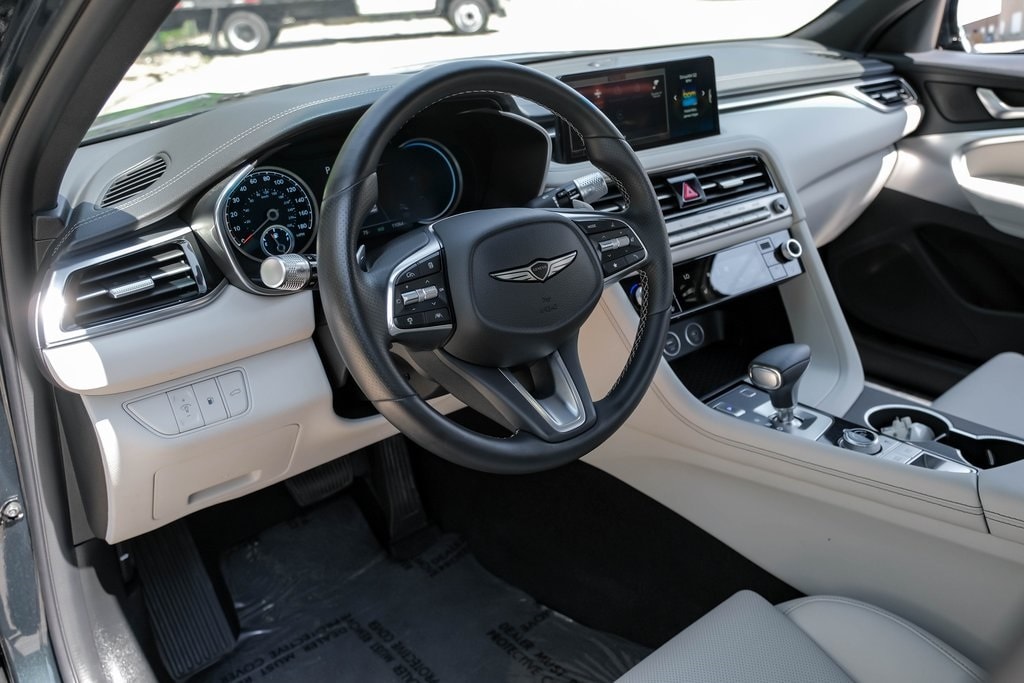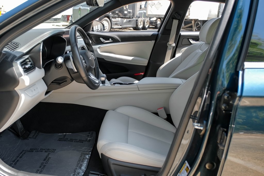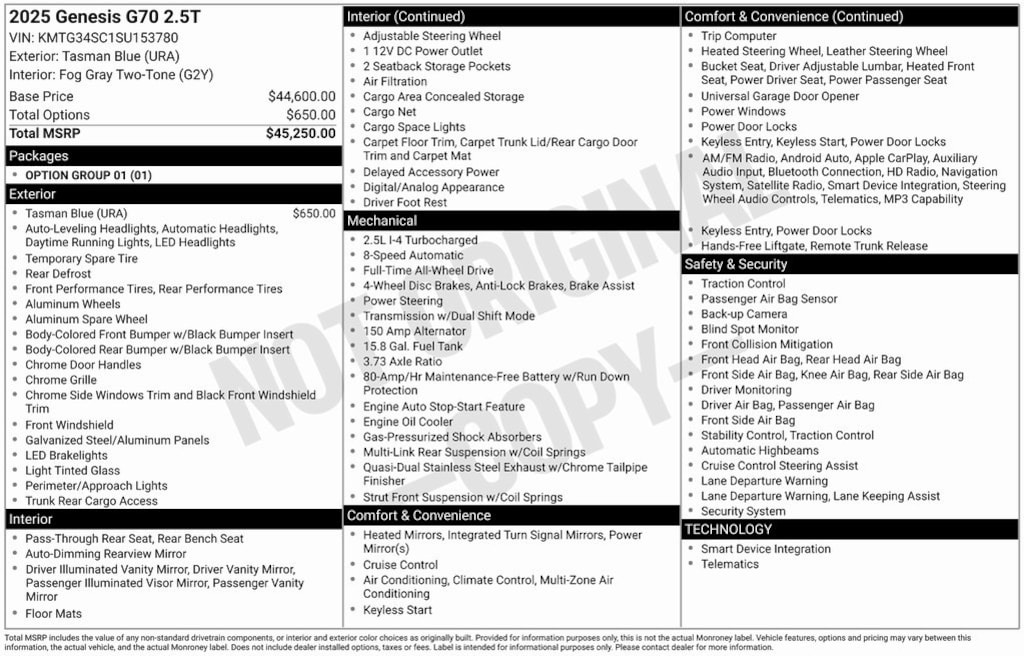 CARFAX One-Owner. Tasman Blue 2025 Genesis G70 2.5T AWD 8-Speed Automatic I4 Option Group 01. Option Group 01, 4-Wheel Disc Brakes, 6 Speakers, ABS brakes, Air Conditioning, Alloy wheels, AM/FM radio: SiriusXM, Android Auto & Apple CarPlay, Anti-whiplash front head restraints, Auto High-beam Headlights, Auto-dimming Rear-View mirror, Automatic temperature control, Brake assist, Bumpers: body-color, Delay-off headlights, Driver door bin, Driver vanity mirror, Dual front impact airbags, Dual front side impact airbags, Electronic Stability Control, Emergency communication system: Genesis Connected Services, Exterior Parking Camera Rear, Four wheel independent suspension, Front anti-roll bar, Front Bucket Seats, Front Center Armrest, Front dual zone A/C, Front reading lights, Fully automatic headlights, Garage door transmitter: HomeLink, Heated door mirrors, Heated front seats, Heated Multi-Adjustable Front Bucket Seats, Illuminated entry, Knee airbag, Leatherette Seating Surfaces, Low tire pressure warning, Navigation System, Occupant sensing airbag, Outside temperature display, Overhead airbag, Overhead console, Panic alarm, Passenger door bin, Passenger vanity mirror, Power door mirrors, Power driver seat, Power passenger seat, Power steering, Power windows, Radio: AM/FM/SiriusXM/HD Audio System, Rear anti-roll bar, Rear reading lights, Rear seat center armrest, Rear side impact airbag, Rear window defroster, Remote keyless entry, Security system, Speed control, Speed-Sensitive Wipers, Split folding rear seat, Steering wheel mounted audio controls, Tachometer, Telescoping steering wheel, Traction control, Trip computer, Turn signal indicator mirrors, Variably intermittent wipers, and Wheels: 19" x 8.0J Fr & 19" x 8.5J Rr Alloy.