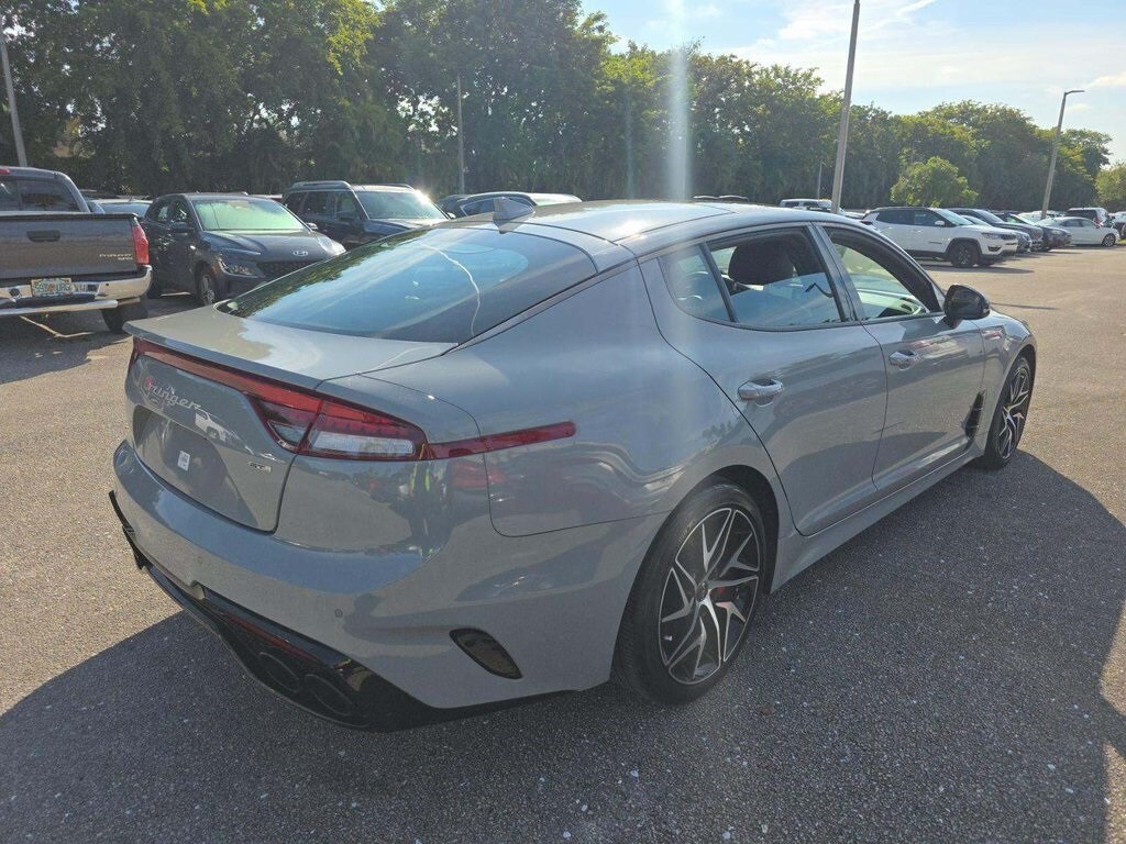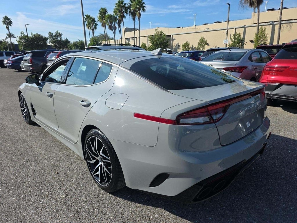 CARFAX One-Owner. Ceramic Silver 2023 Kia Stinger GT-Line RWD 8-Speed Automatic I4 8-Way Power Adjustable Passenger Seat, Black Exhaust Tips, Black Exterior Mirrors, Black Fender Garnish, Brembo Brakes, Carbon Fiber Interior Trim, GT-Line Apex Special Edition Package, Power Tilt & Slide Sunroof w/One-Touch, Radio: harmon/kardon AM/FM/MP3/HD Audio System, Sun & Sound Package. GT-Line Apex Special Edition Package (Black Exhaust Tips, Black Exterior Mirrors, Black Fender Garnish, Brembo Brakes, and Carbon Fiber Interior Trim), Sun & Sound Package (8-Way Power Adjustable Passenger Seat, Power Tilt & Slide Sunroof w/One-Touch, and Radio: harmon/kardon AM/FM/MP3/HD Audio System), 4-Wheel Disc Brakes, 9 Speakers, ABS brakes, Air Conditioning, Alloy wheels, AM/FM radio: SiriusXM, Anti-whiplash front head restraints, Apple CarPlay & Android Auto, Auto High-beam Headlights, Auto-dimming Rear-View mirror, Automatic temperature control, Brake assist, Bumpers: body-color, Carpeted Floor Mat, Delay-off headlights, Driver door bin, Driver vanity mirror, Dual front impact airbags, Dual front side impact airbags, Electronic Stability Control, Emergency communication system, Exterior Parking Camera Rear, Four wheel independent suspension, Front anti-roll bar, Front Bucket Seats, Front Center Armrest, Front dual zone A/C, Front reading lights, Fully automatic headlights, Heated door mirrors, Heated Front Bucket Seats, Heated front seats, Illuminated entry, Knee airbag, Leather Seat Trim, Low tire pressure warning, Navigation System, Occupant sensing airbag, Outside temperature display, Overhead airbag, Overhead console, Panic alarm, Passenger door bin, Passenger vanity mirror, Power door mirrors, Power driver seat, Power steering, Power windows, Radio: AM/FM/MP3/HD Audio System, Rain sensing wipers, Rear air conditioning, Rear anti-roll bar, Rear seat center armrest, Rear window defroster, Remote keyless entry, Seat Back Cargo Tray, Security system, Smart Key w/ Push Button and Remote Start, Speed control, Speed-Sensitive Wipers, Split folding rear seat, Sport steering wheel, Steering wheel mounted audio controls, Tachometer, Telescoping steering wheel, Tilt steering wheel, Traction control, Trip computer, Turn signal indicator mirrors, Variably intermittent wipers, and Wheels: 8.0J x 18 Vertex Alloy.