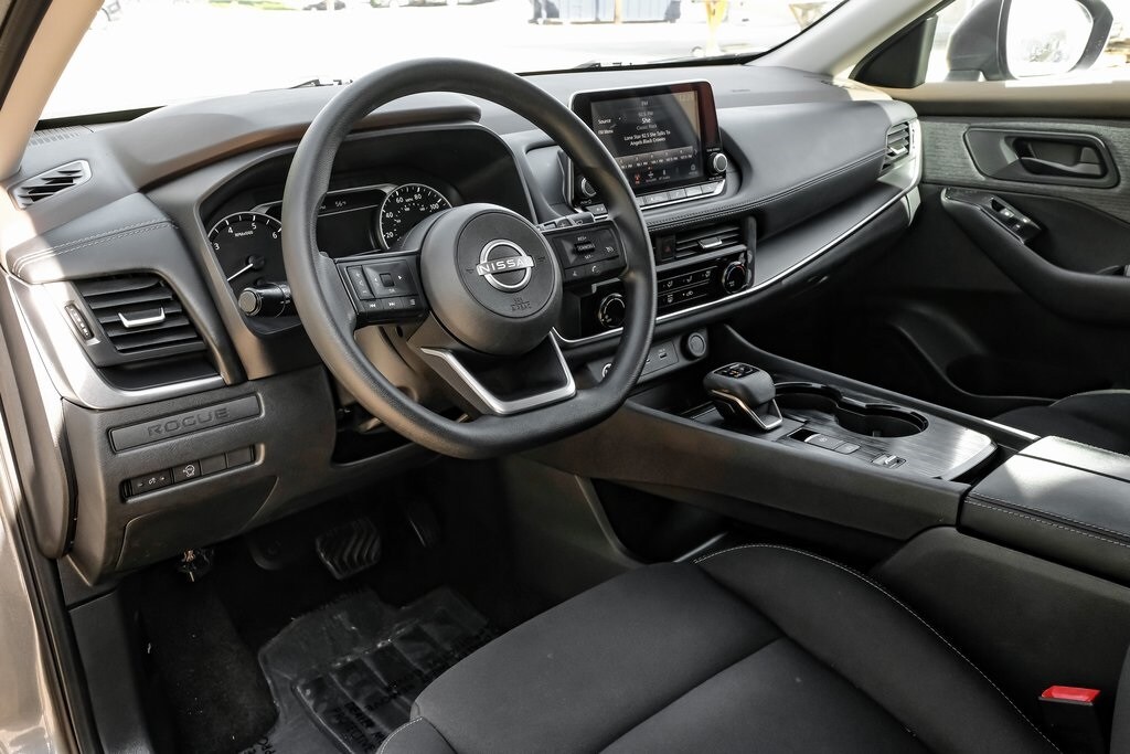 Priced below KBB Fair Purchase Price! CARFAX One-Owner. Gun Metallic 2023 Nissan Rogue S FWD CVT with Xtronic 1.5L I3 Turbocharged DOHC 12V LEV3-ULEV50 201hp 17" Aluminum Alloy Wheels, 4 Speakers, 4-Wheel Disc Brakes, 5.604 Axle Ratio, ABS brakes, Air Conditioning, Alloy wheels, AM/FM Radio, AM/FM radio: SiriusXM, Auto High-beam Headlights, Black Splash Guards (Set of 4), Blind Spot Warning, Brake assist, Bumpers: body-color, Cloth Seat Trim, Delay-off headlights, Driver door bin, Driver vanity mirror, Dual front impact airbags, Dual front side impact airbags, Electronic Stability Control, First Aid Kit, Floor Mats w/1-Piece Cargo Area Protector, Four wheel independent suspension, Front anti-roll bar, Front Bucket Seats, Front Center Armrest, Front reading lights, Fully automatic headlights, Illuminated entry, Knee airbag, Low tire pressure warning, NissanConnect featuring Apple CarPlay and Android Auto, Occupant sensing airbag, Outside temperature display, Overhead airbag, Overhead console, Panic alarm, Passenger door bin, Passenger vanity mirror, Power door mirrors, Power steering, Power windows, Radio data system, Rear anti-roll bar, Rear Parking Sensors, Rear seat center armrest, Rear side impact airbag, Rear window defroster, Rear window wiper, Remote keyless entry, Speed control, Speed-Sensitive Wipers, Split folding rear seat, Spoiler, Steering wheel mounted audio controls, Tachometer, Telescoping steering wheel, Tilt steering wheel, Traction control, Trip computer, and Variably intermittent wipers.