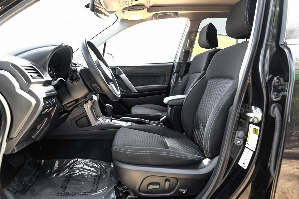 Crystal Black Silica 2018 Subaru Forester 2.5i Premium AWD Lineartronic CVT 2.5L 4-Cylinder DOHC 16V VVT All-Weather Pkg & EyeSight & BSD & Power Rear Gate, Blind Spot Detection w/Rear Cross Traffic Alert, EyeSight System, Heated Exterior Mirrors, Heated Front Seats, High Grade Instrument Cluster w/Color LCD Display, Power Rear Gate, Steering Responsive Fog Lights (SRF), Windshield Wiper De-Icer. All-Weather Pkg & EyeSight & BSD & Power Rear Gate (Blind Spot Detection w/Rear Cross Traffic Alert, EyeSight System, Heated Exterior Mirrors, Heated Front Seats, High Grade Instrument Cluster w/Color LCD Display, Power Rear Gate, Steering Responsive Fog Lights (SRF), and Windshield Wiper De-Icer), 4-Wheel Disc Brakes, 6 Speakers, ABS brakes, Air Conditioning, Alloy wheels, AM/FM radio: SiriusXM, Auto-Dimming Mirror w/Compass & HomeLink, Automatic temperature control, Brake assist, Bumpers: body-color, Cargo Tray, CD player, Driver door bin, Driver vanity mirror, Dual front impact airbags, Dual front side impact airbags, Electronic Stability Control, Emergency communication system: STARLINK, Exterior Parking Camera Rear, Four wheel independent suspension, Front anti-roll bar, Front Bucket Seats, Front Center Armrest, Front reading lights, Illuminated entry, Knee airbag, Low tire pressure warning, Occupant sensing airbag, Outside temperature display, Overhead airbag, Overhead console, Panic alarm, Passenger door bin, Passenger vanity mirror, Power door mirrors, Power driver seat, Power moonroof, Power steering, Power windows, Radio data system, Radio: Subaru Starlink 7.0" Multimedia Plus System, Rear anti-roll bar, Rear Bumper Cover, Rear seat center armrest, Rear window defroster, Rear window wiper, Remote Engine Starter - Key Start, Remote keyless entry, Roof rack: rails only, Security system, Speed control, Split folding rear seat, Spoiler, Steering wheel mounted audio controls, Tachometer, Telescoping steering wheel, Tilt steering wheel, Traction control, Trip computer, and Variably intermittent wipers.