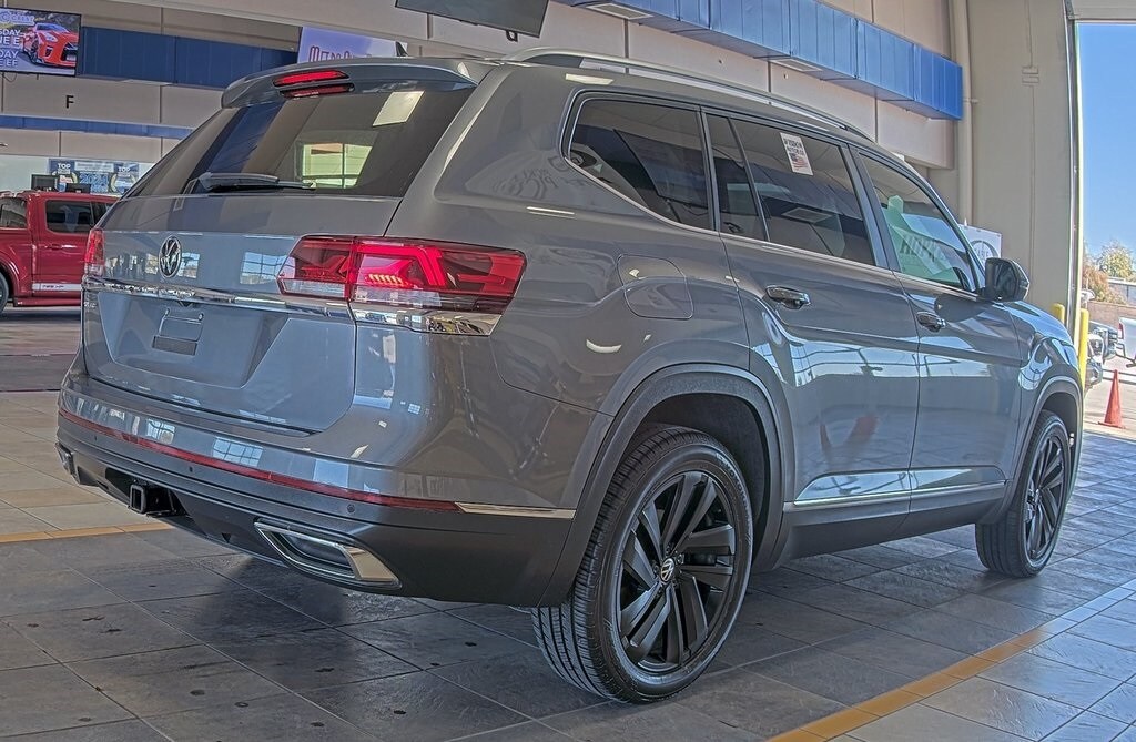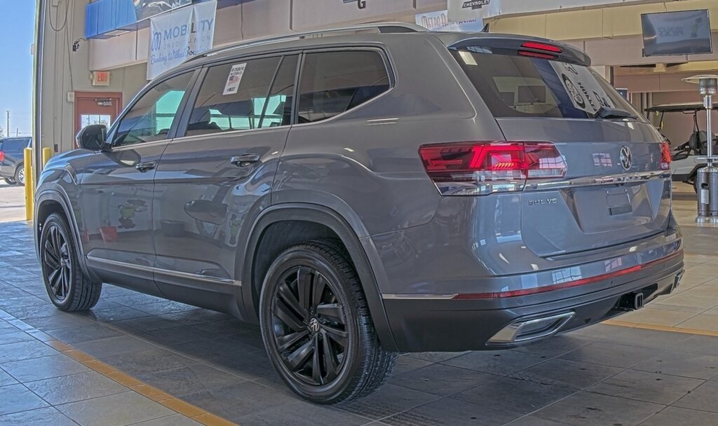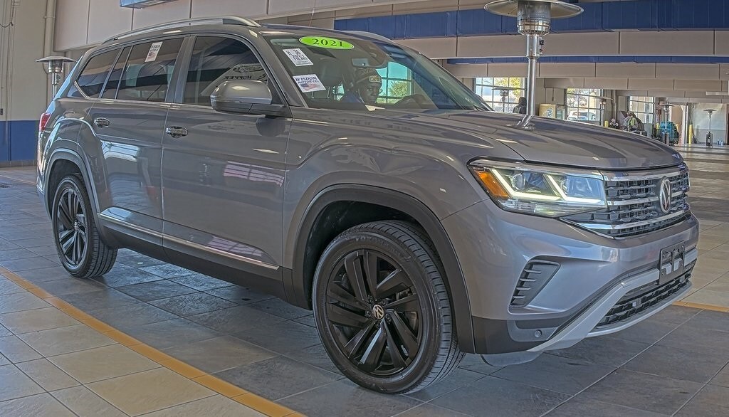 CARFAX One-Owner. Gray 2021 Volkswagen Atlas SEL FWD 8-Speed Automatic with Tiptronic 3.6L V6 3.60 Axle Ratio, 3rd row seats: split-bench, 4-Wheel Disc Brakes, 6 Speakers, ABS brakes, Air Conditioning, Alloy wheels, Auto High-beam Headlights, Auto-dimming Rear-View mirror, Automatic temperature control, Brake assist, Bumpers: body-color, Compass, Delay-off headlights, Driver door bin, Driver vanity mirror, Dual front impact airbags, Dual front side impact airbags, Electronic Stability Control, Emergency communication system: VW Car-Net services (capabilities require enrollment or subscription), Exterior Parking Camera Rear, Four wheel independent suspension, Front anti-roll bar, Front Bucket Seats, Front Center Armrest, Front dual zone A/C, Front fog lights, Front reading lights, Fully automatic headlights, Heated Comfort Front Bucket Seats, Heated door mirrors, Heated front seats, Heated steering wheel, Illuminated entry, Leather Shift Knob, Low tire pressure warning, Memory seat, Navigation System, Occupant sensing airbag, Outside temperature display, Overhead airbag, Overhead console, Panic alarm, Passenger door bin, Passenger vanity mirror, Perforated V-Tex Leatherette Seating Surfaces, Power door mirrors, Power driver seat, Power Liftgate, Power moonroof, Power passenger seat, Power steering, Power windows, Radio data system, Rain sensing wipers, Rear air conditioning, Rear anti-roll bar, Rear reading lights, Rear seat center armrest, Rear window defroster, Rear window wiper, Remote keyless entry, Roof rack: rails only, Security system, Speed control, Speed-sensing steering, Split folding rear seat, Spoiler, Standard Suspension, Steering wheel mounted audio controls, Tachometer, Telescoping steering wheel, Tilt steering wheel, Traction control, Trip computer, Turn signal indicator mirrors, and Variably intermittent wipers.