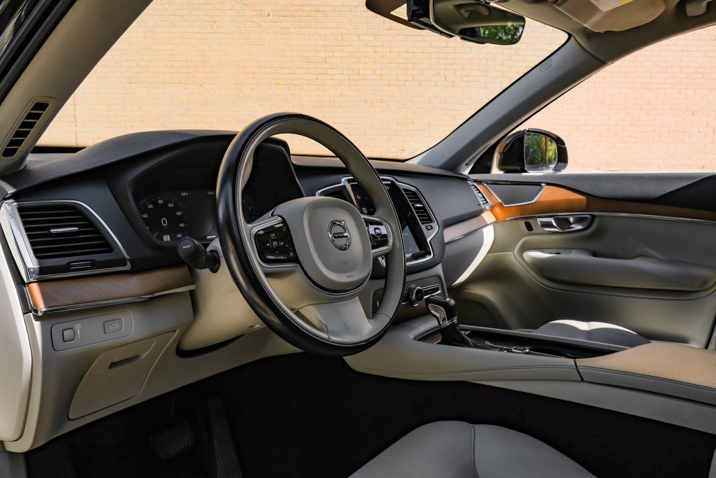 CARFAX One-Owner. Onyx Black Metallic 2021 Volvo XC90 T6 Momentum AWD Automatic with Geartronic I4 Supercharged AWD, Blond/Charcoal Leather. AWD, Blond/Charcoal Leather, 10 Speakers, 3rd row seats: bucket, 4-Wheel Disc Brakes, ABS brakes, Air Conditioning, Alloy wheels, AM/FM radio: SiriusXM, Anti-whiplash front head restraints, Apple CarPlay/Android Auto, Auto High-beam Headlights, Auto-dimming door mirrors, Auto-dimming Rear-View mirror, Automatic temperature control, Brake assist, Bumpers: body-color, Delay-off headlights, Driver door bin, Driver vanity mirror, Dual front impact airbags, Dual front side impact airbags, Electronic Stability Control, Emergency communication system: Volvo On-Call w/4 year subscription, Exterior Parking Camera Rear, Four wheel independent suspension, Front anti-roll bar, Front Bucket Seats, Front Center Armrest w/Storage, Front dual zone A/C, Front fog lights, Front reading lights, Fully automatic headlights, Garage door transmitter: HomeLink, Genuine wood dashboard insert, Genuine wood door panel insert, Headlight cleaning, Heated door mirrors, Heated Front Bucket Seats, Heated front seats, Illuminated entry, Knee airbag, Leather Shift Knob, Leather Upholstery, Low tire pressure warning, Memory seat, Navigation system: Sensus Navigation, Occupant sensing airbag, Outside temperature display, Overhead airbag, Panic alarm, Passenger door bin, Passenger vanity mirror, Power door mirrors, Power driver seat, Power Liftgate, Power moonroof, Power passenger seat, Power steering, Power windows, Premium audio system: Sensus Connect, Radio data system, Radio: High Performance Audio System w/Sensus Nav, Rain sensing wipers, Rear air conditioning, Rear anti-roll bar, Rear dual zone A/C, Rear fog lights, Rear reading lights, Rear seat center armrest, Rear window defroster, Rear window wiper, Remote keyless entry, Roof rack: rails only, Security system, Speed control, Speed-sensing steering, Split folding rear seat, Spoiler, Steering wheel mounted audio controls, Tachometer, Telescoping steering wheel, Tilt steering wheel, Traction control, Trip computer, Turn signal indicator mirrors, Variably intermittent wipers, and Wheels: 19" 6-Spoke Turbine Sparkling Silver Alloy.