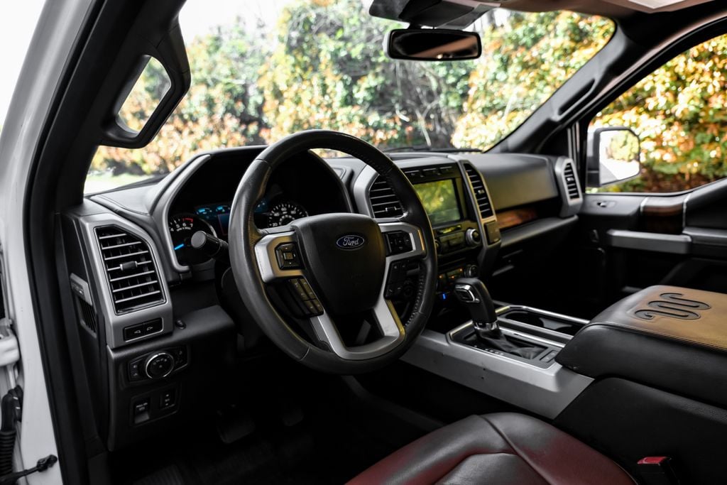 Oxford White 2018 Ford F-150 King Ranch RWD 10-Speed Automatic 3.5L V6 EcoBoost 20" Machined-Aluminum Wheels, Active Park Assist, BLIS Blind Spot Information System, Bright Belt Moldings, Chrome Door Handles w/Body-Color Strap, Chrome Front & Rear Bumpers, Chrome Skull Caps on Exterior Mirrors, Class IV Trailer Hitch Receiver, Equipment Group 601A Luxury, Higher-Capacity Radiator, Higher-Power Cooling Fans, Inflatable Rear Safety Belts, King Ranch Chrome Appearance Package, Lane-Keeping System, Multi-Contour Driver & Passenger Seats, Power-Deployable Running Boards, Pro Trailer Backup Assist, Tailgate Step w/Tailgate Lift Assist, Technology Package, Trailer Tow Package, Upgraded Front Stabilizer Bar, Wheels: 20" Chrome-Like PVD. Equipment Group 601A Luxury (20" Machined-Aluminum Wheels, BLIS Blind Spot Information System, Inflatable Rear Safety Belts, Multi-Contour Driver & Passenger Seats, Power-Deployable Running Boards, and Tailgate Step w/Tailgate Lift Assist), King Ranch Chrome Appearance Package (Bright Belt Moldings, Chrome Door Handles w/Body-Color Strap, Chrome Front & Rear Bumpers, Chrome Skull Caps on Exterior Mirrors, and Wheels: 20" Chrome-Like PVD), Technology Package (Active Park Assist and Lane-Keeping System), Trailer Tow Package (Class IV Trailer Hitch Receiver, Higher-Capacity Radiator, Higher-Power Cooling Fans, Pro Trailer Backup Assist, and Upgraded Front Stabilizer Bar), 10 Speakers, 18" Machined-Aluminum Wheels, 3.15 Axle Ratio, 4-Wheel Disc Brakes, ABS brakes, Adjustable pedals, Air Conditioning, Alloy wheels, AM/FM radio: SiriusXM, AppLink/Apple CarPlay and Android Auto, Auto High-beam Headlights, Auto tilt-away steering wheel, Auto-dimming door mirrors, Auto-dimming Rear-View mirror, Automatic temperature control, Box Side Steps, Brake assist, CD player, Compass, Delay-off headlights, Driver door bin, Driver vanity mirror, Dual front impact airbags, Dual front side impact airbags, Electronic Stability Control, Emergency communication system: SYNC 3 911 Assist, Exterior Parking Camera Rear, Front anti-roll bar, Trip computer, Turn signal indicator mirrors, Twin Panel Moonroof, Variably intermittent wipers, Ventilated front seats, Voice-Activated Touchscreen Navigation System, and Voltmeter.